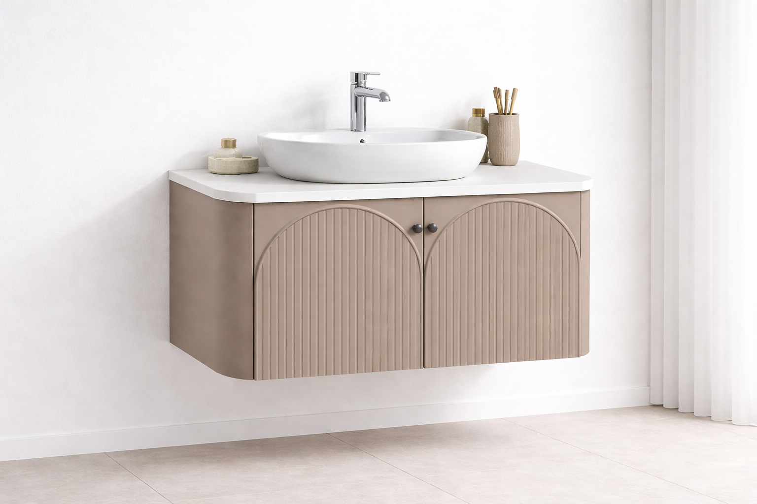 Dieser Waschtisch besticht durch sein modernes, minimalistisches Design. Die sanfte Beige-Farbgebung harmoniert perfekt mit der weißen Arbeitsplatte und dem ovalen Keramikbecken und schafft so eine warme und elegante Atmosphäre. Die Schranktüren mit ihren geschwungenen und vertikalen Streifen lassen den Raum größer wirken und bieten gleichzeitig praktischen Stauraum – die ideale Wahl für ein modernes Badezimmer.